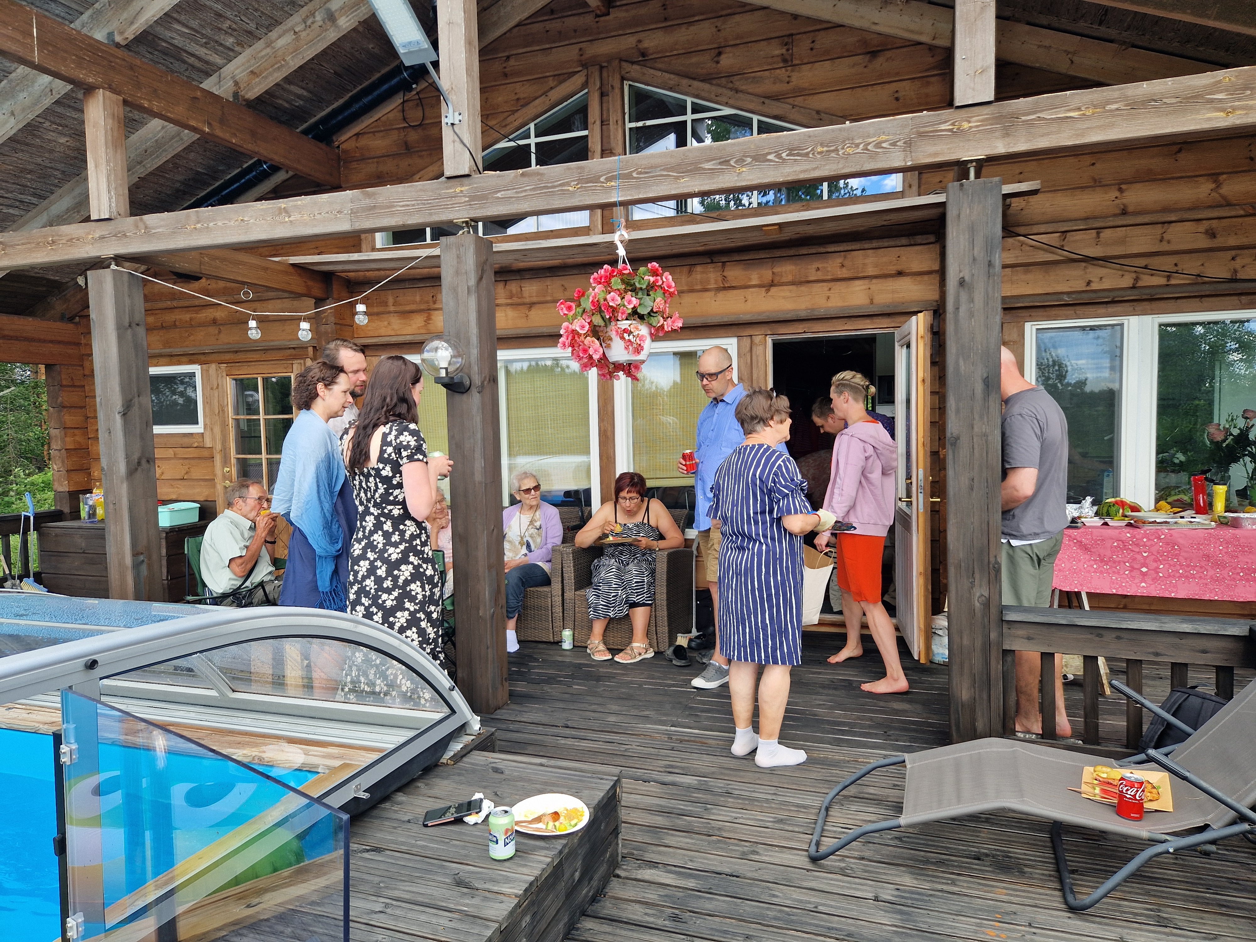 Istumapaikkojahan meidän mökillä ei ole kuin muutamille, mutta onneksi rennoissa bileissä istua voi myös terassilla ja portailla jalkoja ilmassa heilutellen. 😁